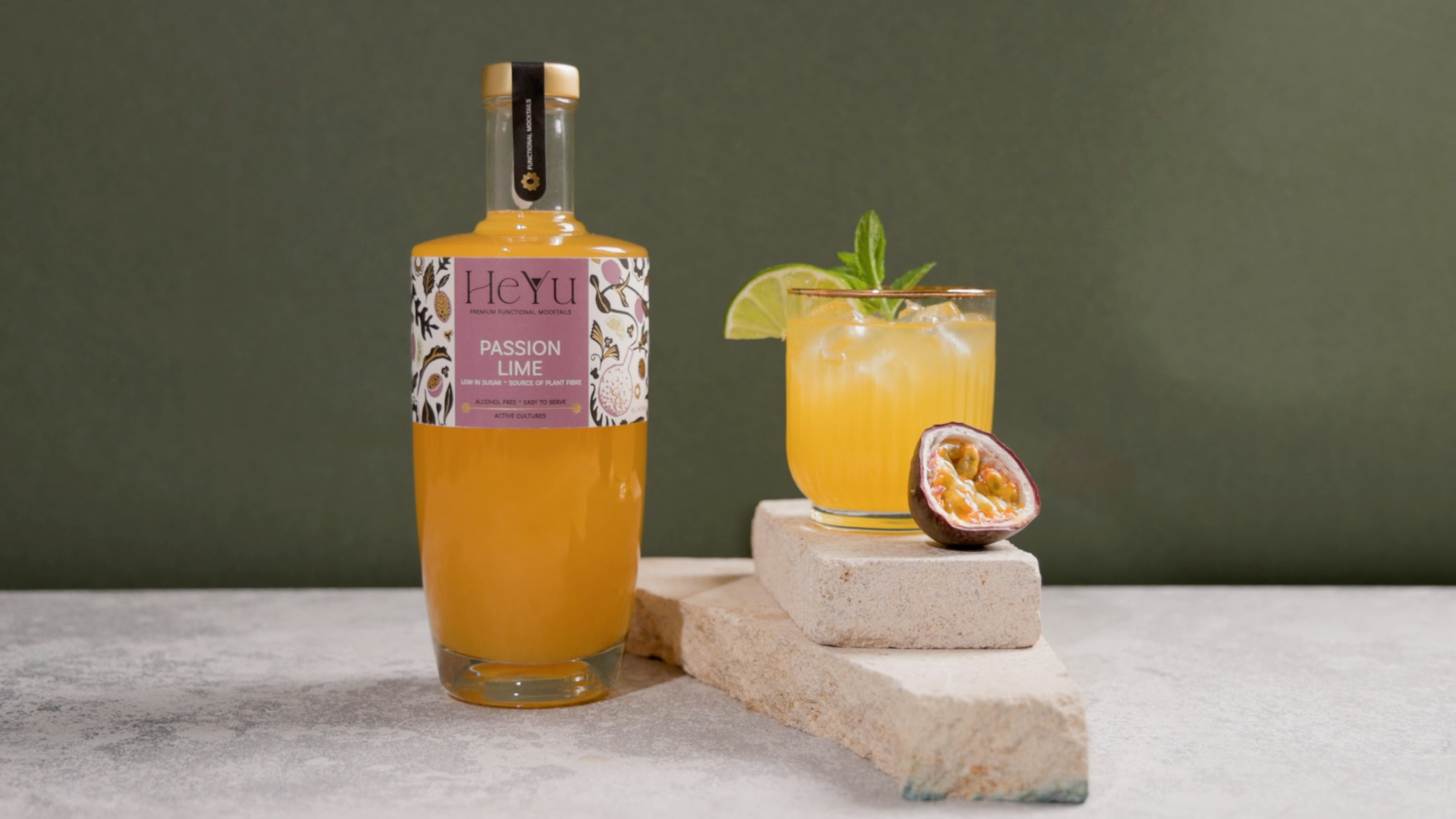 Heyu Passion Lime is a refreshing mocktail based on passionfruit juice and waterkefir, finished with an elegant balance between a sour kick of lime juice and fresh mint.